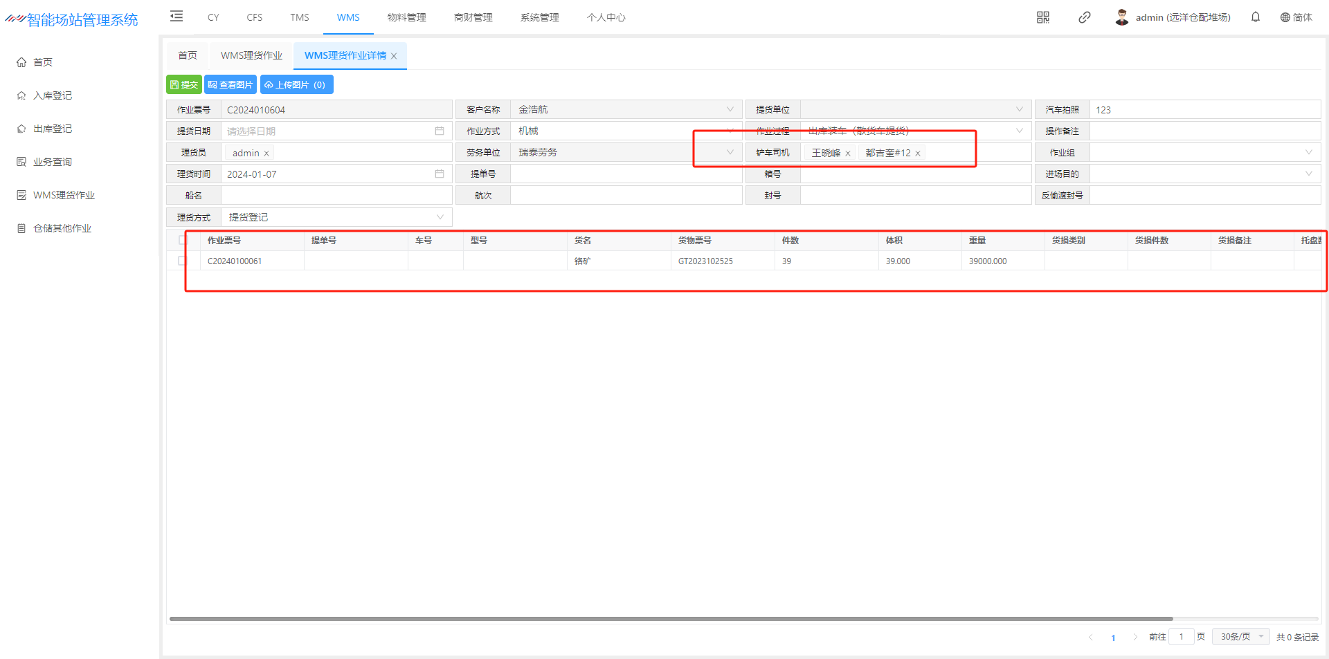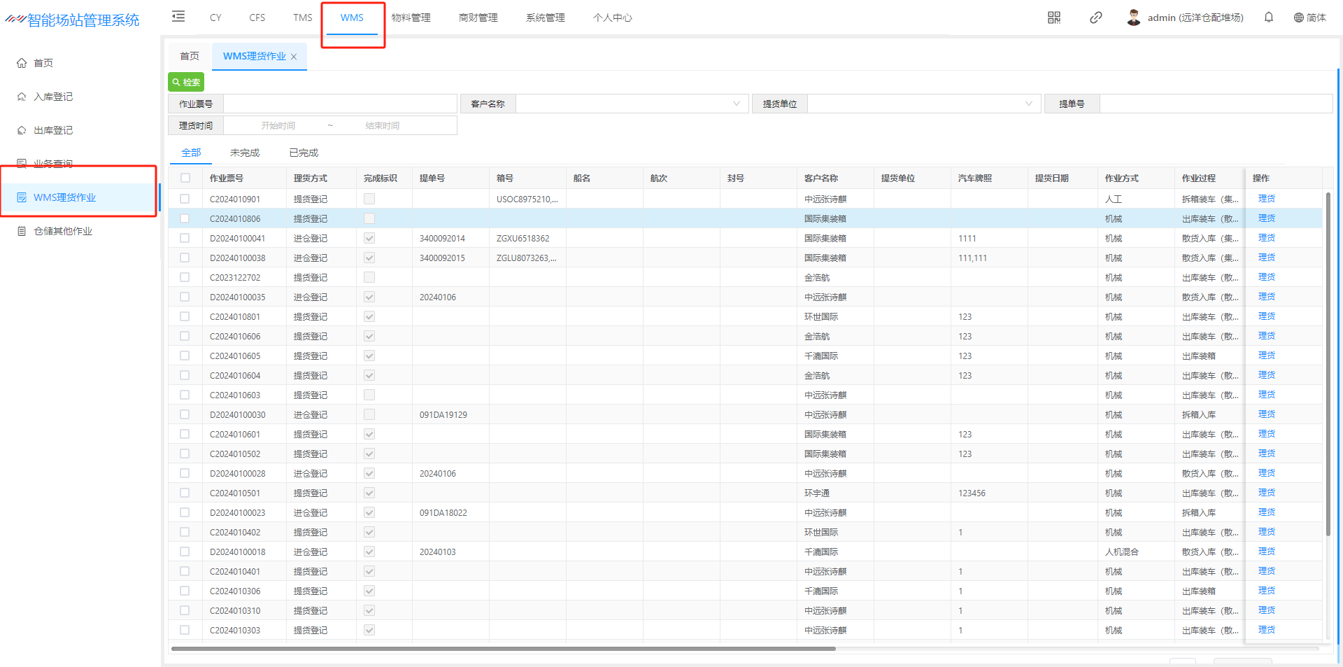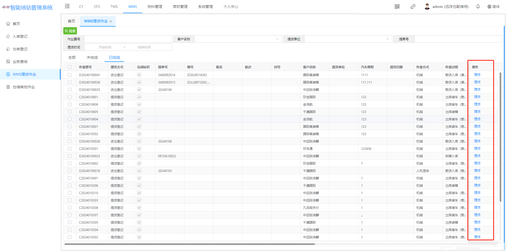 ## 列表功能介绍: 分类:列表分为六类:未完成、已完成、全部 检索:可以按客作业票号、客户名称、提货单位、提单号、理货时间  点击左边“理货”,可以查看详细的理货信息  可以查看详细的理货信息