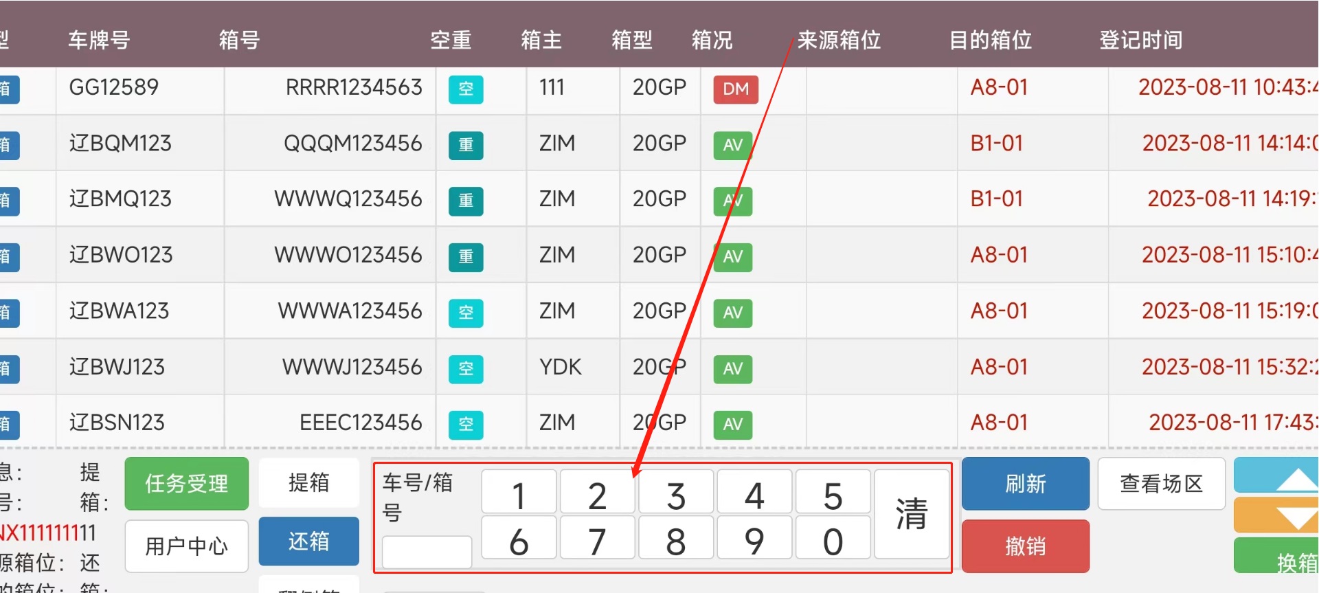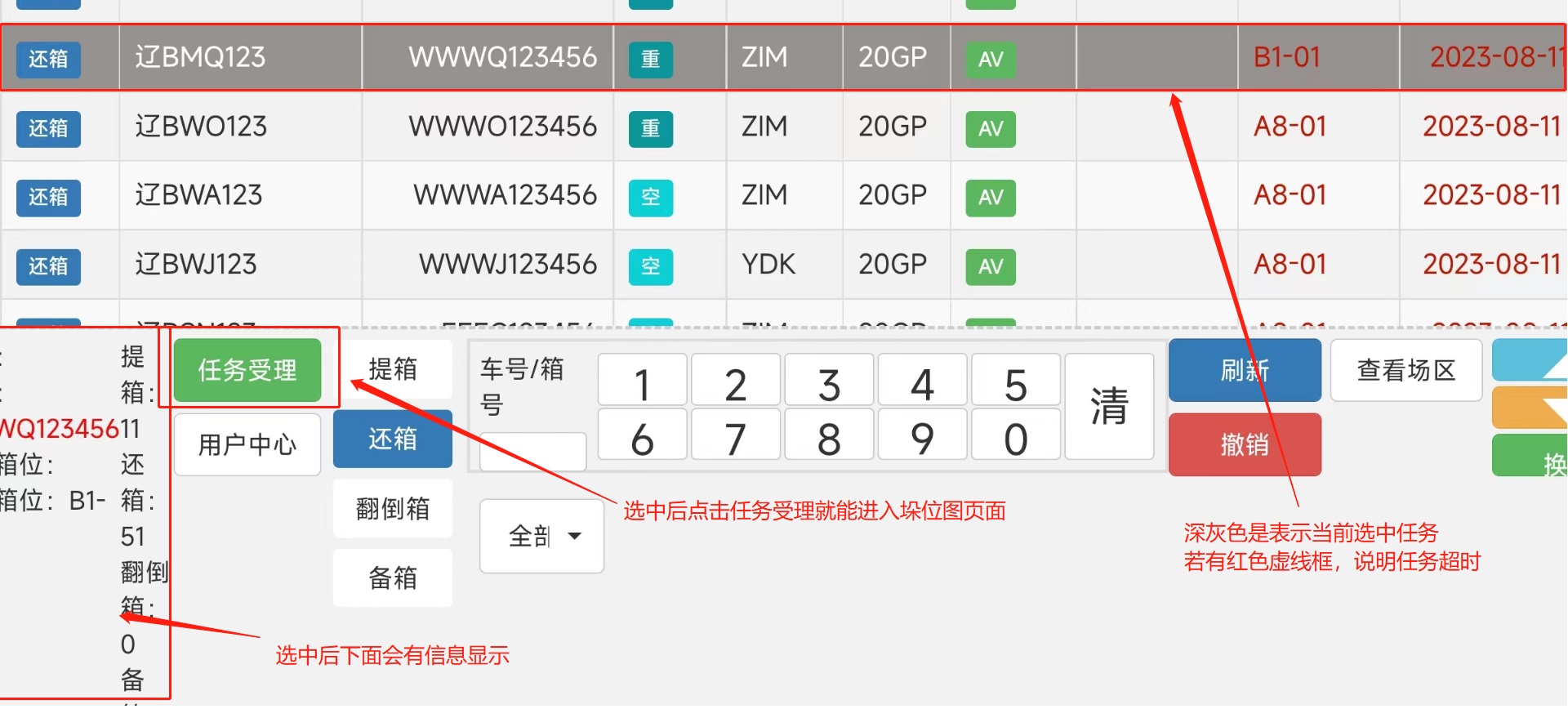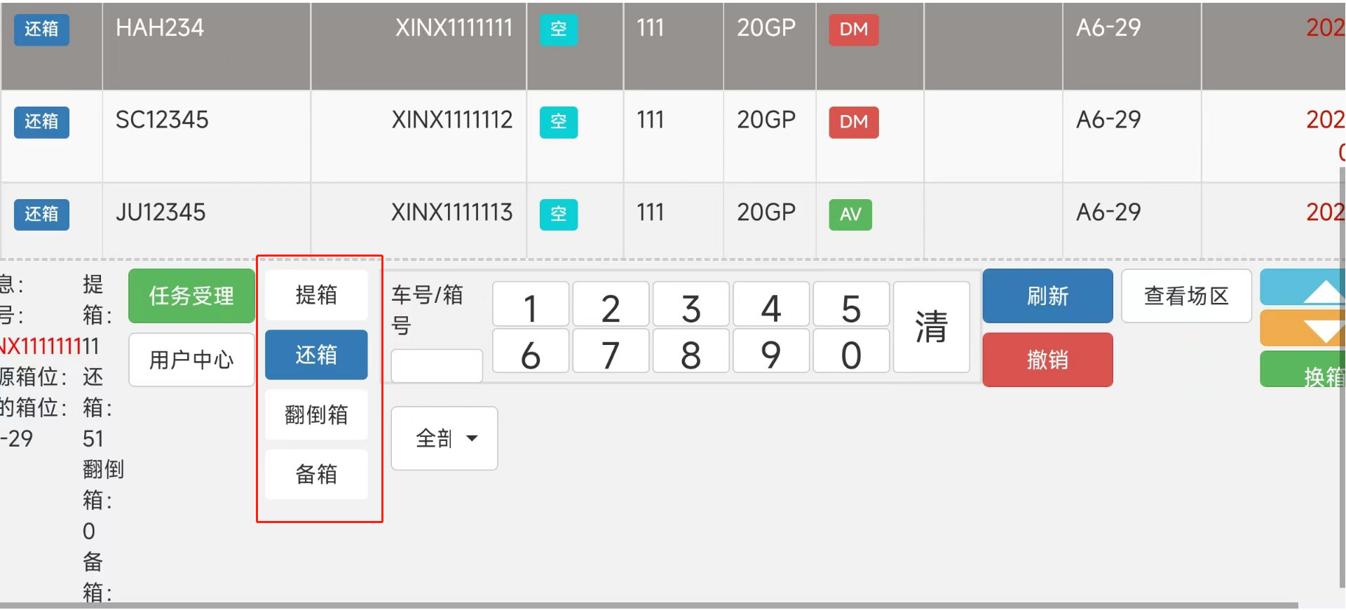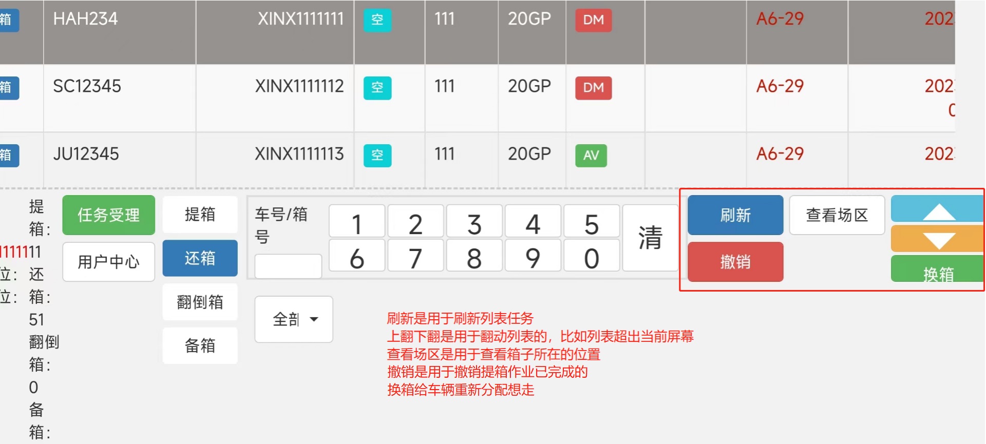 > <span style="font-family:楷体">注:由于我是用的手机进行的测试,一些样式不太完整 要样式完整的话,请用平板配合使用</span> ## 1、登录操作  输入账号密码进行登录 堆场:下拉选择(来源:CY基础资料-堆场设置) 设备名称:下拉选择(来源:CY基础资料-机械设备)  ## 2、页面介绍 #### 1)、软键盘区用于检索列表内箱号和车牌号,清:删除输入的车牌号/箱号 功能区域分上方是任务区域,下方是功能区域。 任务列表排序根据时间正序排列,但同一垛位区域的默认在最前面。在每次任务完成后刷新和定时刷新。任务超时5分钟的时间会逐步字体颜色加深,超过20分钟变为红色。 功能区域有下列功能: ①箱信息展示 箱号、提箱数、还箱数、来源箱位、目标箱位 ②任务受理:点击任务受理进入垛位图。 ③用户中心:设置用字自定义页面显示。 ④车号/箱号:车号箱号快速查询,只需要输入数字部分的1到2个数字,系统自动筛选出符合的任务 ⑤任务类型:任务类型筛选,包括提箱、还箱、翻倒。  #### 2)、用户中心用于系统设置   #### 3)、类型选择;提箱、还箱、翻到箱、备箱 ⑥刷新:手动刷新列表 。 ⑦撤销:撤销作业。(限制未出场业务,已出场任务不能执行此操作)。 ⑧查看场区 查看场区垛位图。 ⑨单箱翻倒:此功能是给车载司机在没有中控发起翻倒任务时,能手动发起单箱翻倒任务。任务指派给自己或他人。此功能可以在后台参数设置关闭。 ⑩换箱:换箱是提箱作业完成后,客户对集装箱不满意,车载司机可以自行选择一个场内符合系统规则要求的箱子生成换箱作业。换箱作业会自动生成一个落箱作业,当落箱作业完成后系统自动生成一个提箱作业。此功能权限可以在后台关闭。  #### 4)、上一页,下一页,刷新列表;撤销入场操作  ## 3、操作流程 司机点击任务受理后,进入垛位界面。如上图所示。系统会根据中控场区计划,推荐一个最优的箱位置。并且用粉红色底色闪动提示。作业完成之后,点击【接收任务】 任务就完成了。 任务受理界面功能: 接收任务:任务完成确认。 返回列表:返回上级列表; 过车:适用与两个任务(提箱和还箱),进行箱子交换。减少机械动作。后台可控制过车数量。 设置满垛:设置满垛后场地计划执行完毕,箱管人员可以在3D场区图看到满垛标识。满垛后系统推荐自动到下一个优先级计划。