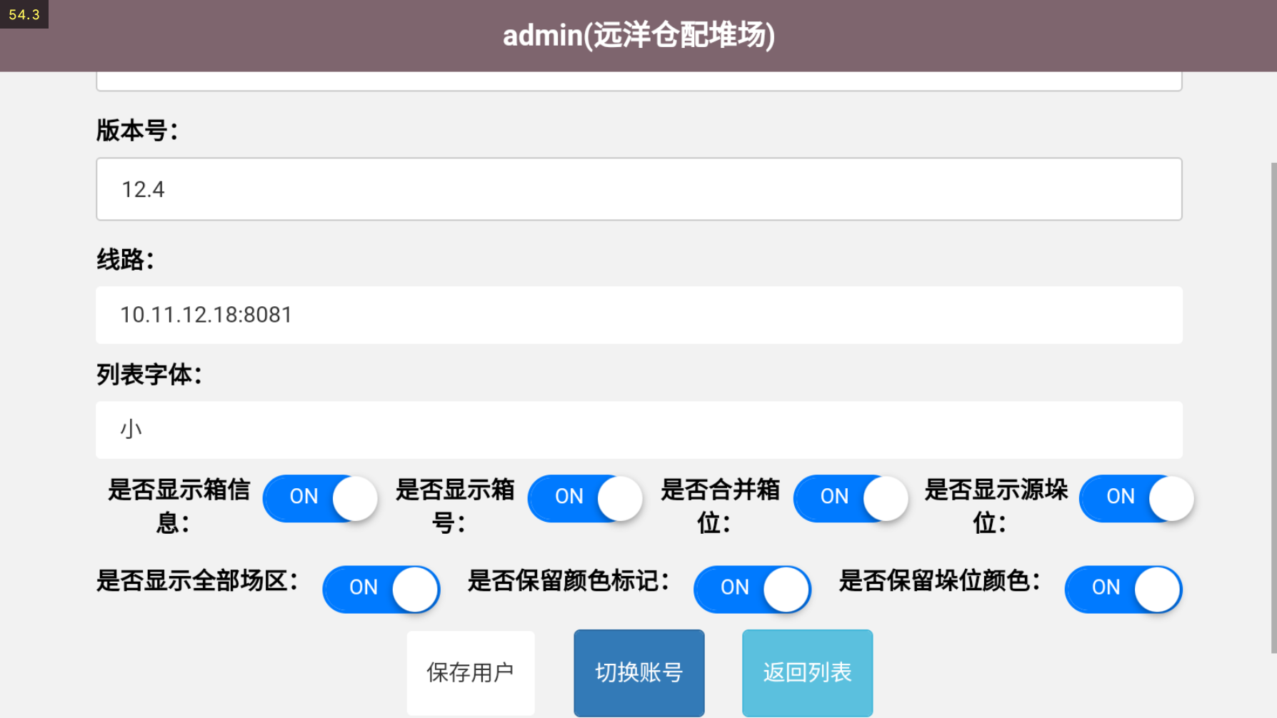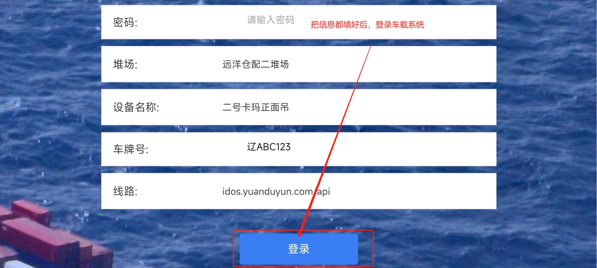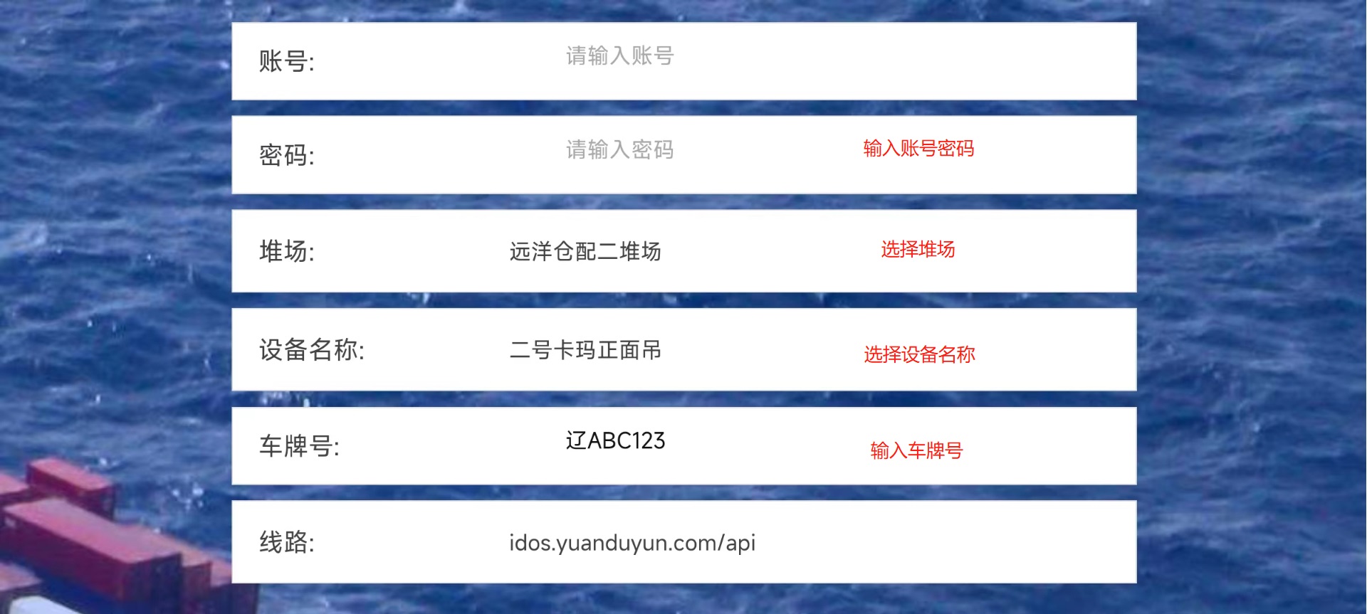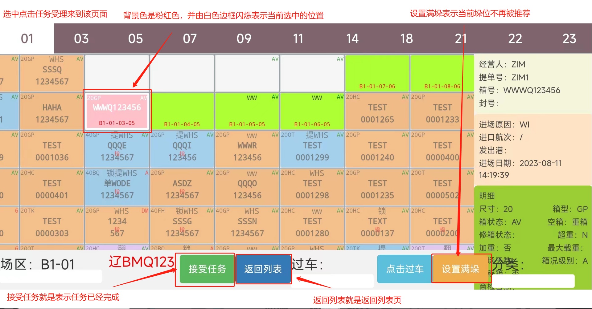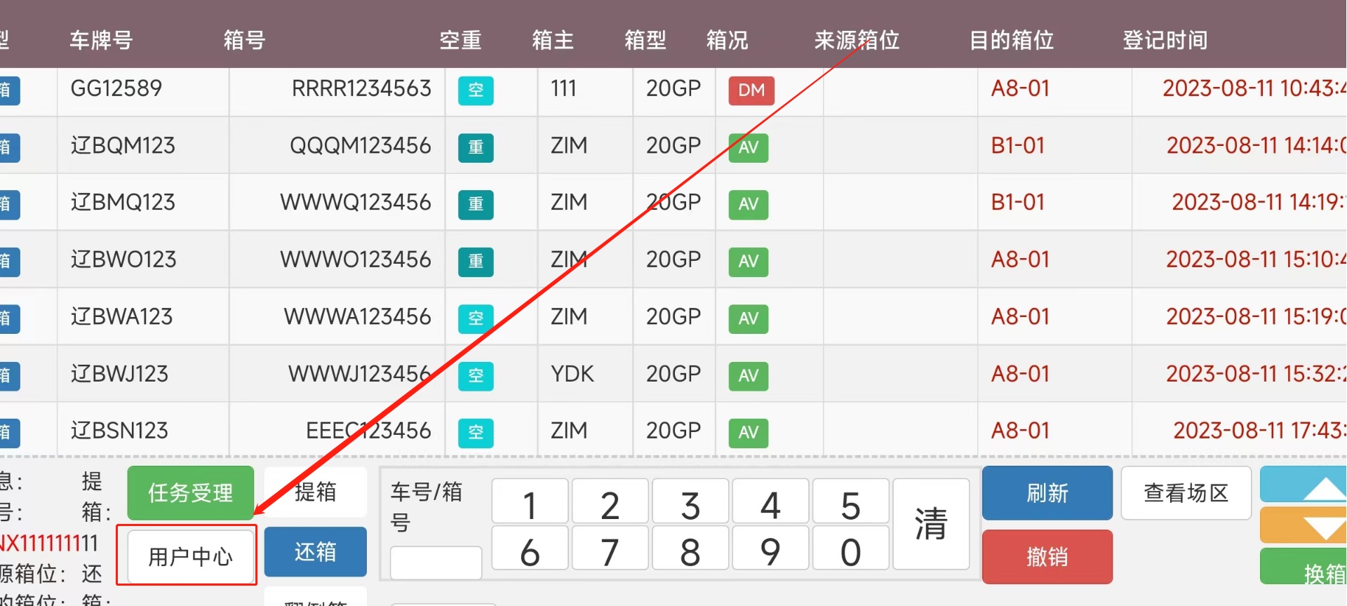 > <span style="font-family:楷体">注:由于我是用的手机进行的测试,一些样式不太完整 要样式完整的话,请用平板配合使用</span> ## 1、登录操作  输入账号密码进行登录 堆场:下拉选择(来源:CY基础资料-堆场设置) 设备名称:下拉选择(来源:CY基础资料-机械设备)  ## 2、页面介绍 #### 1)、软键盘区用于检索列表内箱号和车牌号,清:删除输入的车牌号/箱号 功能区域分上方是任务区域,下方是功能区域。 任务列表排序根据时间正序排列,但同一垛位区域的默认在最前面。在每次任务完成后刷新和定时刷新。任务超时5分钟的时间会逐步字体颜色加深,超过20分钟变为红色。 功能区域有下列功能: ①箱信息展示 箱号、提箱数、还箱数、来源箱位、目标箱位 ②任务受理:点击任务受理进入垛位图。 ③用户中心:设置用字自定义页面显示。 ④车号/箱号:车号箱号快速查询,只需要输入数字部分的1到2个数字,系统自动筛选出符合的任务 ⑤任务类型:任务类型筛选,包括提箱、还箱、翻倒。  #### 2)、用户中心用于系统设置   #### 3)、类型选择;提箱、还箱、翻到箱、备箱 ⑥刷新:手动刷新列表 。 ⑦撤销:撤销作业。(限制未出场业务,已出场任务不能执行此操作)。 ⑧查看场区 查看场区垛位图。 ⑨单箱翻倒:此功能是给车载司机在没有中控发起翻倒任务时,能手动发起单箱翻倒任务。任务指派给自己或他人。此功能可以在后台参数设置关闭。 ⑩换箱:换箱是提箱作业完成后,客户对集装箱不满意,车载司机可以自行选择一个场内符合系统规则要求的箱子生成换箱作业。换箱作业会自动生成一个落箱作业,当落箱作业完成后系统自动生成一个提箱作业。此功能权限可以在后台关闭。  #### 4)、上一页,下一页,刷新列表;撤销入场操作  ## 3、操作流程 司机点击任务受理后,进入垛位界面。如上图所示。系统会根据中控场区计划,推荐一个最优的箱位置。并且用粉红色底色闪动提示。作业完成之后,点击【接收任务】 任务就完成了。 任务受理界面功能: 接收任务:任务完成确认。 返回列表:返回上级列表; 过车:适用与两个任务(提箱和还箱),进行箱子交换。减少机械动作。后台可控制过车数量。 设置满垛:设置满垛后场地计划执行完毕,箱管人员可以在3D场区图看到满垛标识。满垛后系统推荐自动到下一个优先级计划。