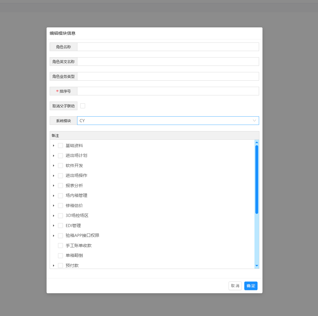 角色管理 可以新增、修改、删除 角色对应的看到的页面权限  新增角色 填入角色名称、角色英文名称、角色业务类型、排序号(必填项)、取消父子联动(不勾选例如选择进场计划时,会把进场计划下权限全都勾选;勾选之后不自动勾选进场计划下其他权限)、系统模块(切换各个系统板块 赋予权限)
