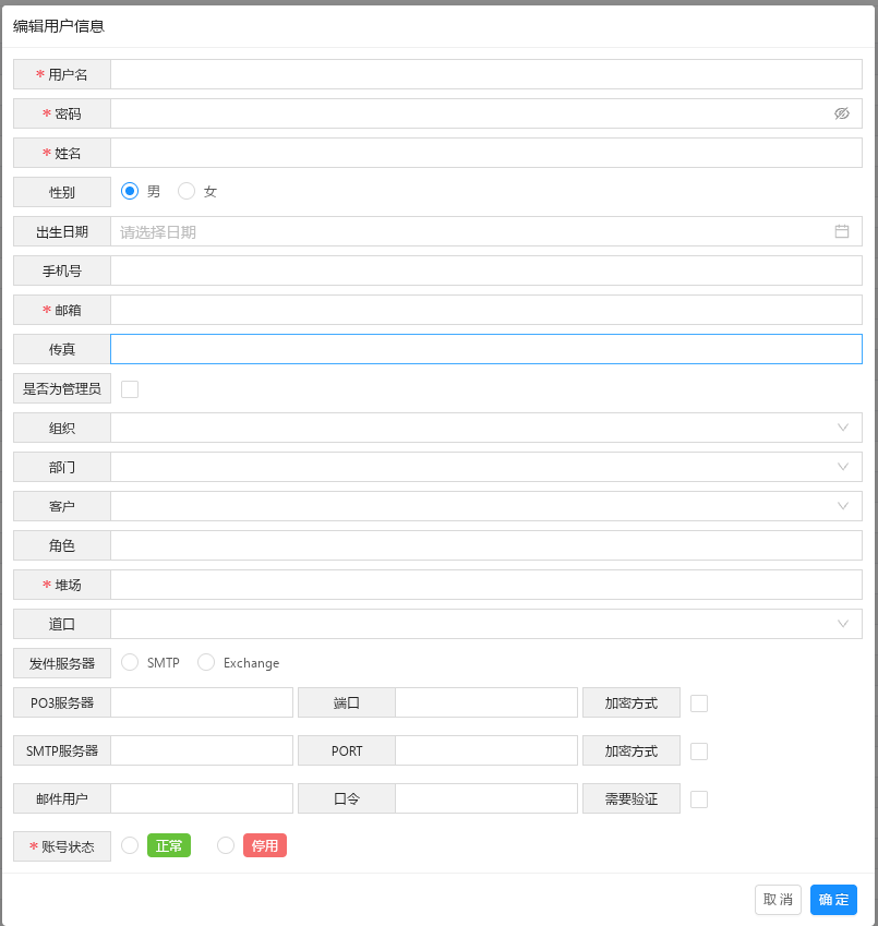 用户管理查看系统中所有用户信息,具有修改密码,新建用户账号信息功能  新建用户信息 填入用户名(一般填入用户姓名拼音)、密码(要符合格式,大小写英文、特殊字符、数字)、姓名、邮箱、堆场、账号状态 以上为必填项目 角色:下拉数据来源 维护的角色管理