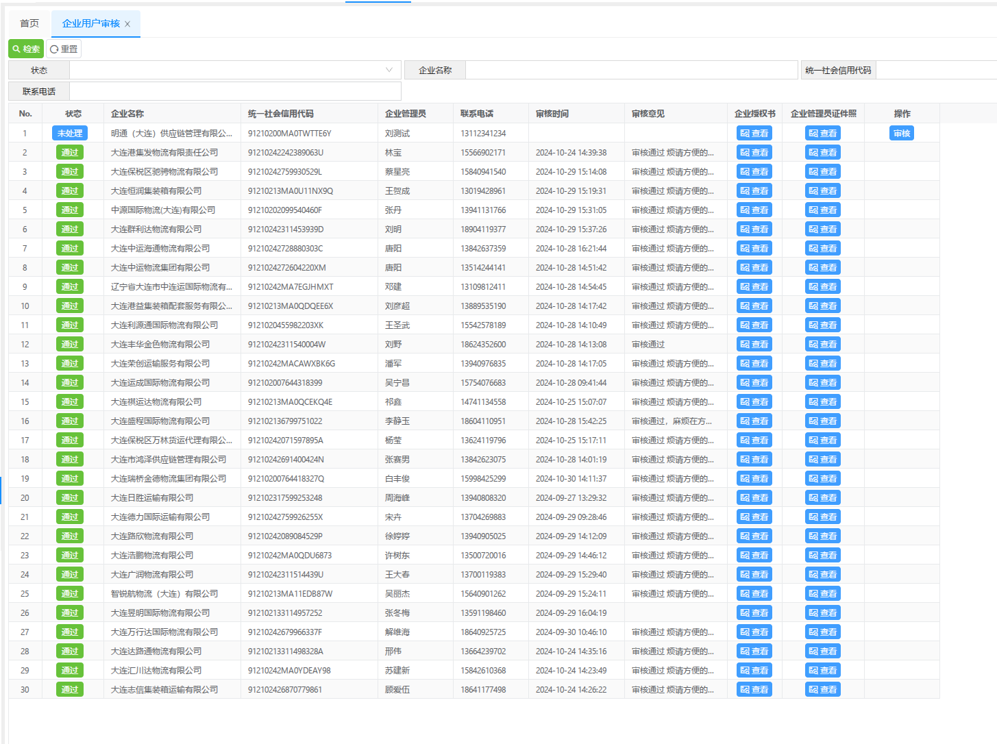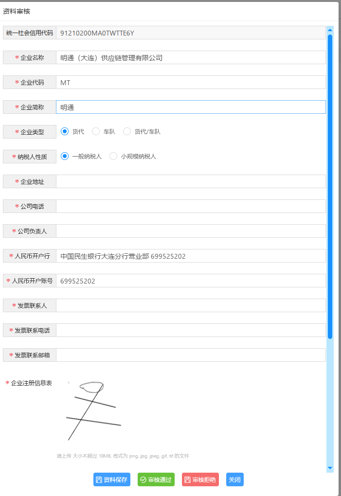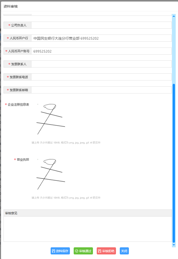 客户预约系统,预约之后在此业务进行审核 可以查看企业授权书图片、企业管理员证件照片  点击【审核】,查看提交详情页面 资料保存:一般用于,客户资料提交不完整的情况下,资料保存会会在业务系统,但是否有效是”否“ 审核通过:审核通过之后,给客户发送审核短信 审核拒绝:审核拒绝,将会将拒绝信息通过短信的形式发给客户
